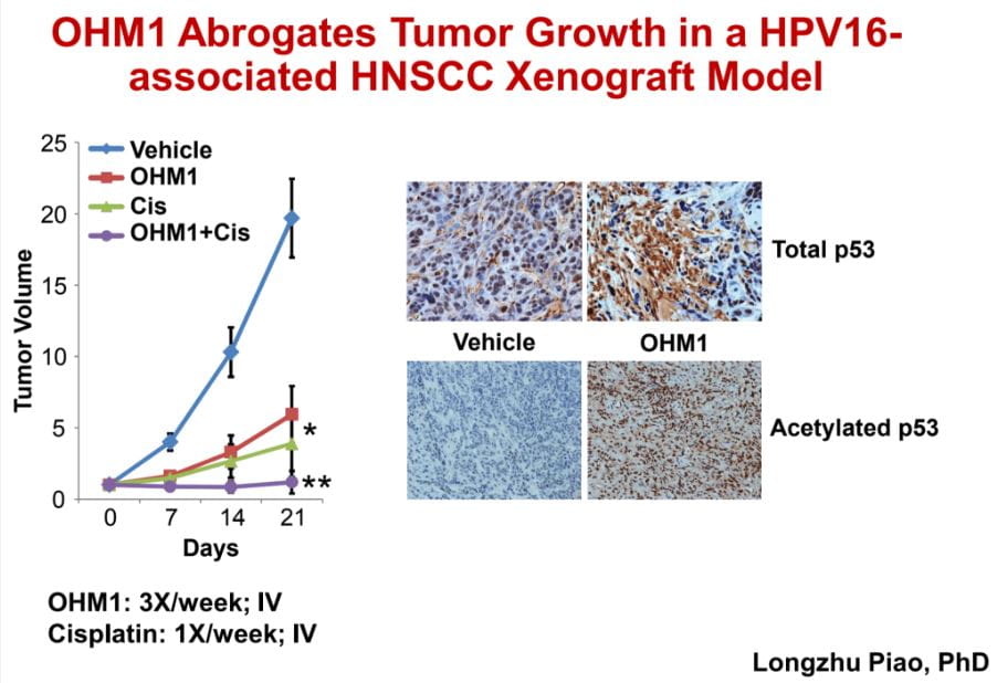Dr. Pan and his team showed that HPV proteins interact with a host protein, p300, in HPV-driven cancer cells to block activation of p53 and RB. They realized that disrupting this interaction may be a simple way to release p300 and reactivate p53 and RB.