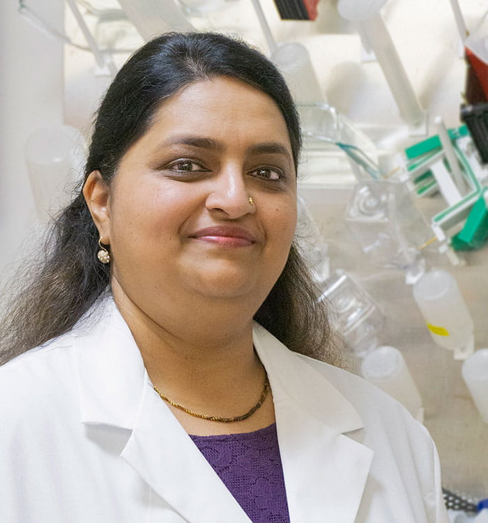 In January 2022, a research team from UH Seidman Cancer Center and Case Western Reserve University published a groundbreaking report in the journal Nature Communications, detailing a novel approach to chimeric antigen receptor (CAR) T-cell therapy for B-cell cancers. The new B-cell activating factor (BAFF) CAR T product, developed by UH Seidman and CWRU scientist Reshmi Parameswaran, MS, PhD, and colleagues, binds specifically to each of three receptors instead of one – BAFF-R, BCMA and TACI, providing more therapeutic options and guarding against the problem of antigen escape currently found in CAR T therapies that solely target CD19. Experimental results showed that the BAFF CAR T is effective at killing multiple B-cell cancers, with robust in vitro and in vivo cytotoxicity exerted by BAFF CAR T-cells against mantle cell lymphoma, multiple myeloma and acute lymphoblastic leukemia xenograft mouse models.