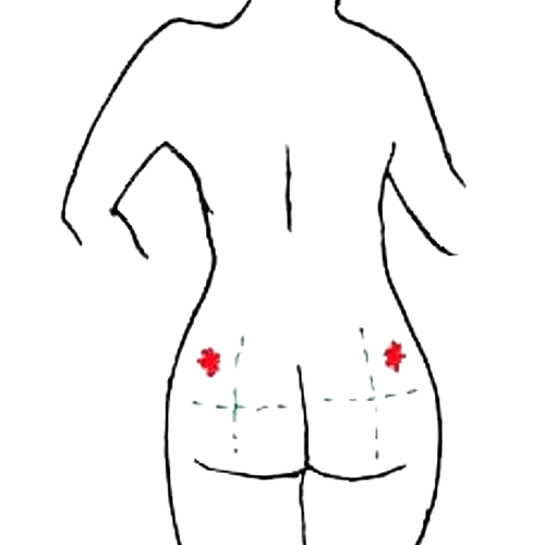 - Stretch the injection site with your thumb and index finger. Insert needle into the upper-outer quadrant of the buttock (see image) using a quick dart like motion. The needle must be inserted completely leaving none of the needle exposed. Use slow, steady pressure on the plunger to inject all of the medication.